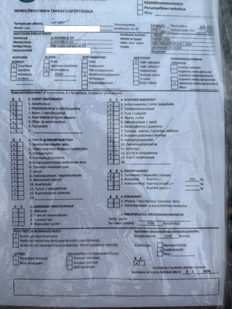 - Suurin sivu-ulottuma 7,5 m (215 kg) / 9,5m ( 120 kg)