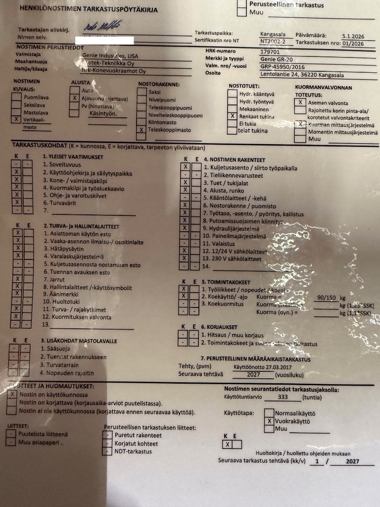 Helppokäyttöinen ja nostin ahtaisiin paikkoihin. Jatkolava antaa lisäulottumaa työskentelyyn ahtaissa paikoissa. Vähän käytetty ja siisti. 10v. tarkastus 2027
