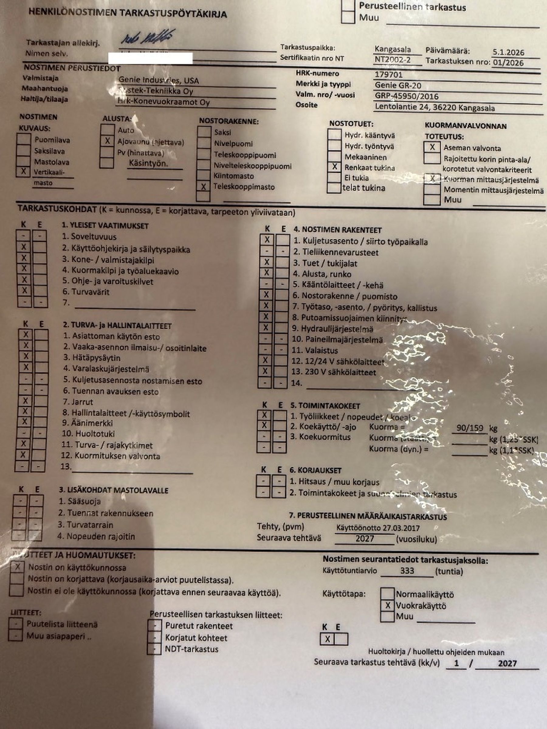 Genie GR20 teleskooppimastonostin. Valmiina toimitukseen. Määräaikaistarkastetaan ennen toimitusta.
