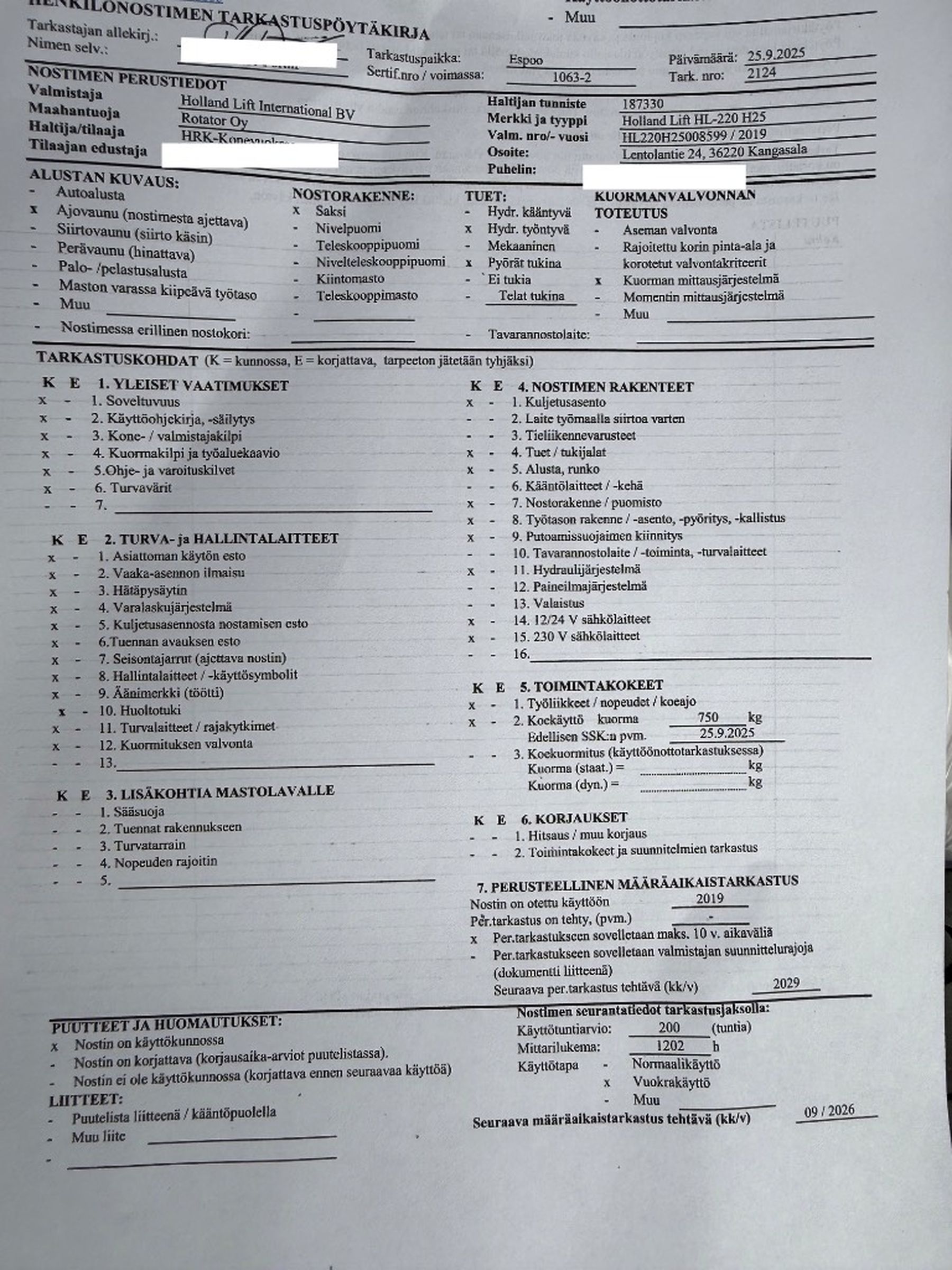 - Suurin kuorma: 750 kg / 4 hlö.